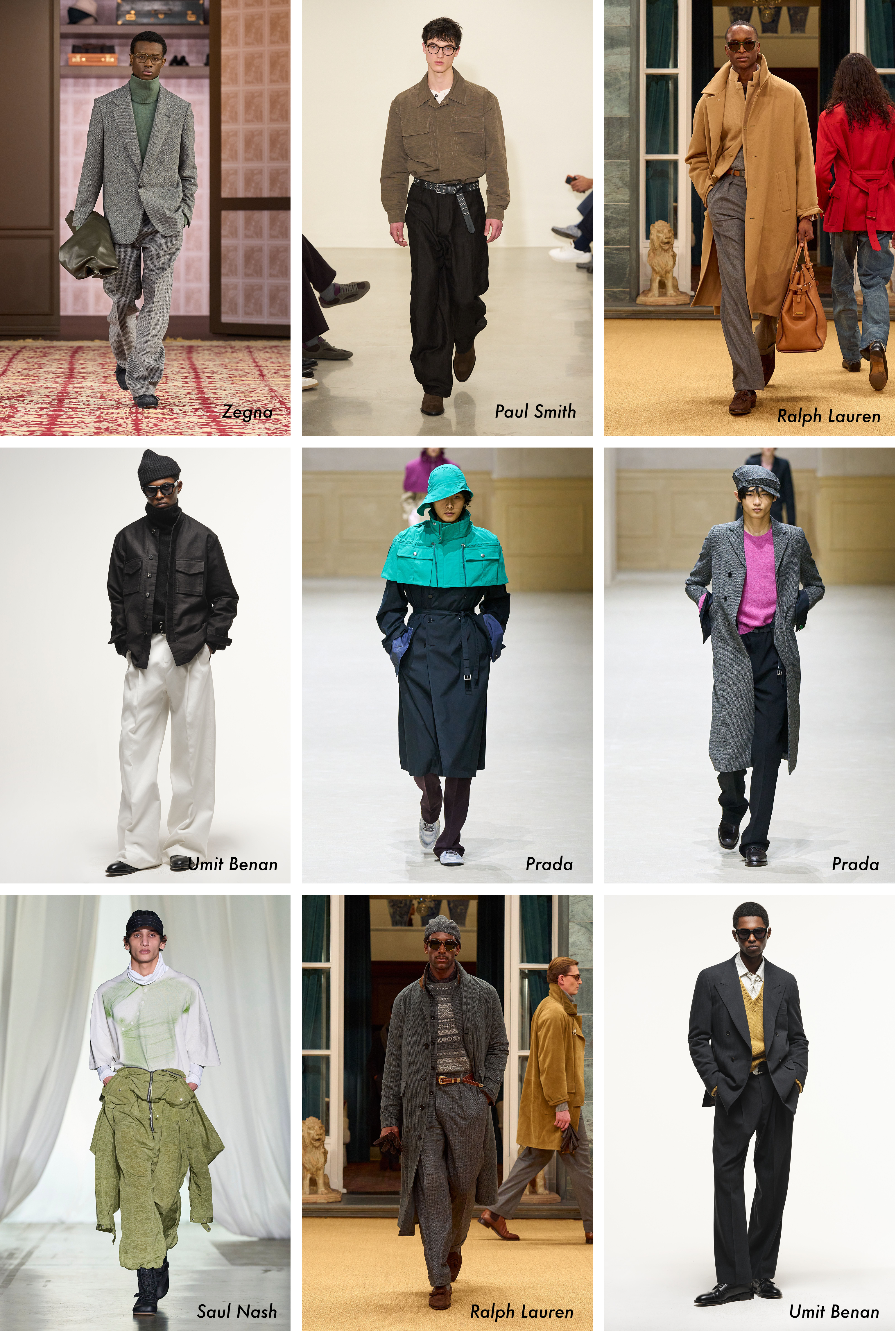 FORMS: Wide and soft are the key words. Long-length jackets, gentler shoulders, double-breasted and belted blazers, and wide trousers with a soft taper. Structured pieces are styled with relaxed elements to land in that new “formal, but lived-in” zone.