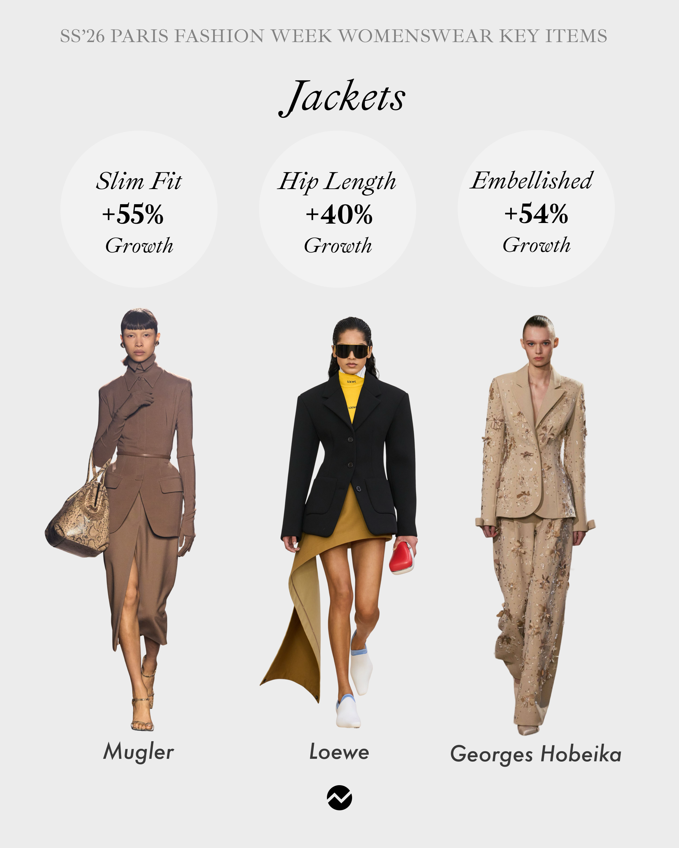 Paris Fashion Week SS26 confirmed the hip-length jacket as one of the defining silhouettes of the season followed closely by the waist-line and long-line jackets rising in prominence. Whether cut with sculpted precision or soft, fluid forms, the new jacket balances structure and movement with modern ease. Rendered in sleek, light-catching fabrics, these pieces bridge sharp tailoring with sensual flow. From high-shine leather to refined tweeds and crisp cottons, runway collections showcased a palette rooted in timeless black and white, punctuated by confident reds that injected instant energy. From Loewe to Mugler, key designers: Tom Ford (16), Agnes B (15), Acne Studios (11), Casablanca (11), Nina Ricci (11), Elie Saab (10), Givenchy (10), Loewe (10), Coperni (9), Lacoste (9), Matieres Fecales (9), Undercover (9), Akris (8), Balmain (8), Benjamin Benmoyal (8), Celine (8), Maison Margiela (8), Miu Miu (8), Shiatzy Chen (8), Thom Browne (8)