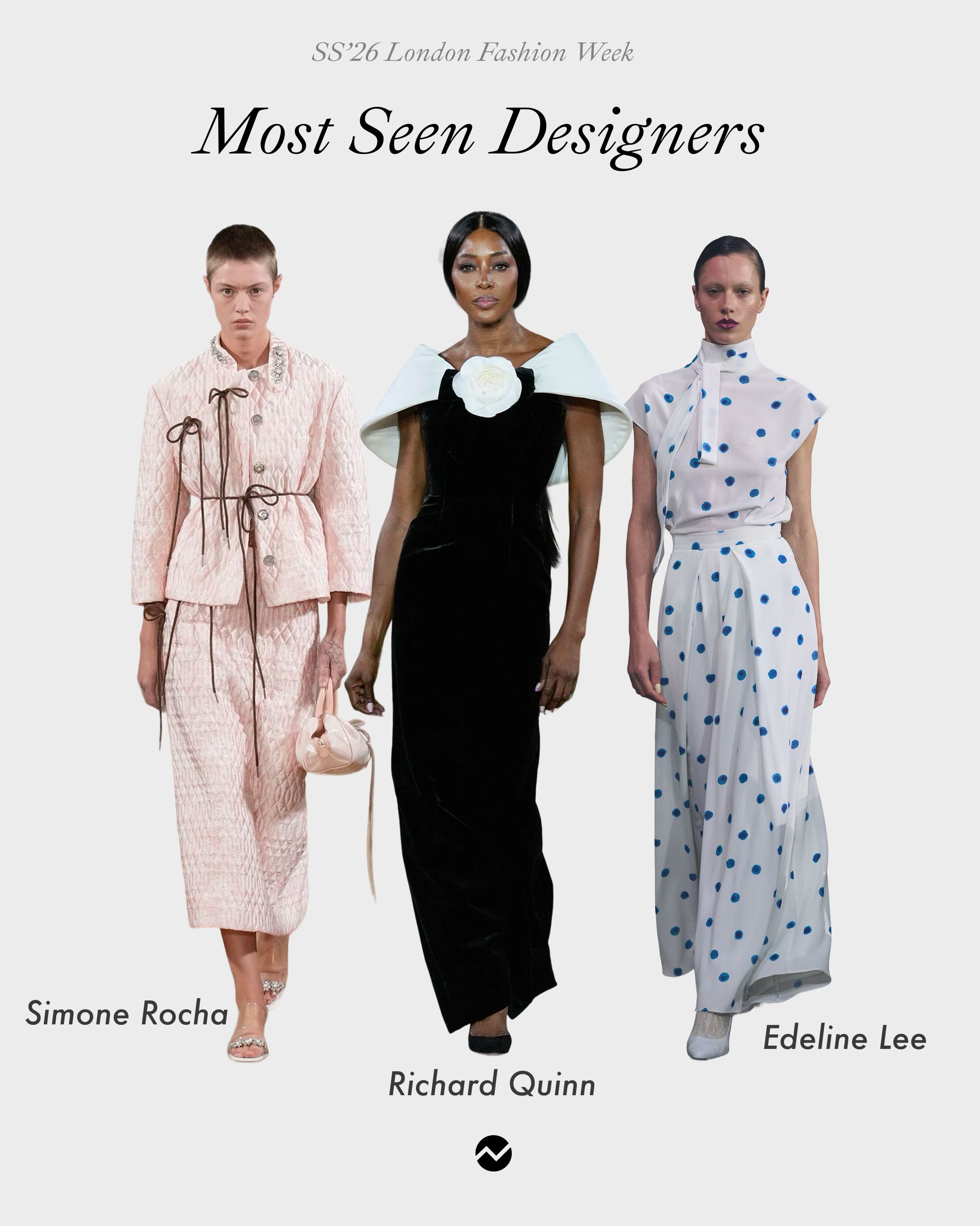 On the other side, the most seen designers—Richard Quinn, Simone Rocha, and Edeline Lee—dominated the runways with their distinctive aesthetics, setting the tone for the broader womenswear market.