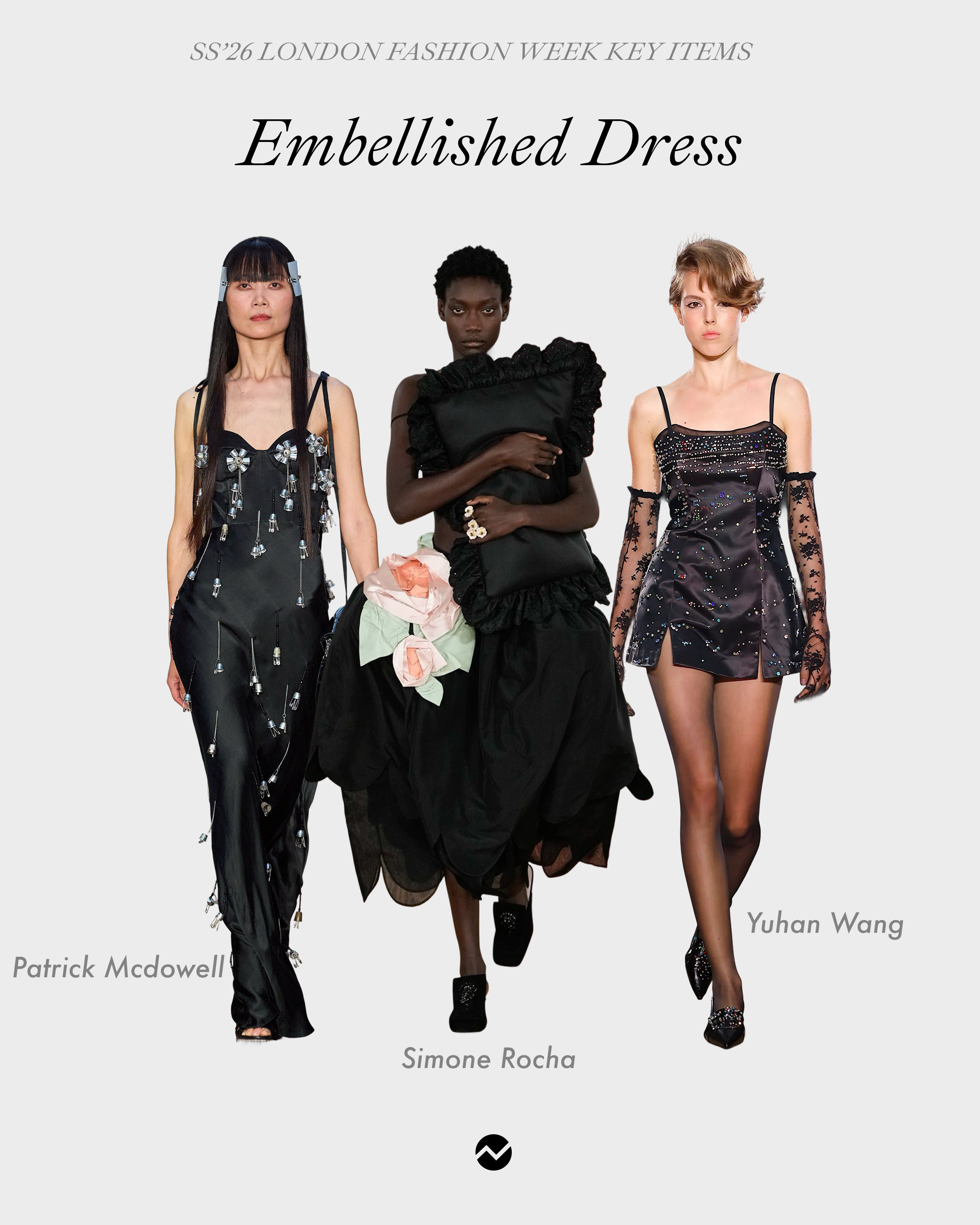 The S/S 26 London Fashion Week trends are defined by contrasts: edgy tailoring and embellished detailing meet soft pastel hues and sheer fabrics.