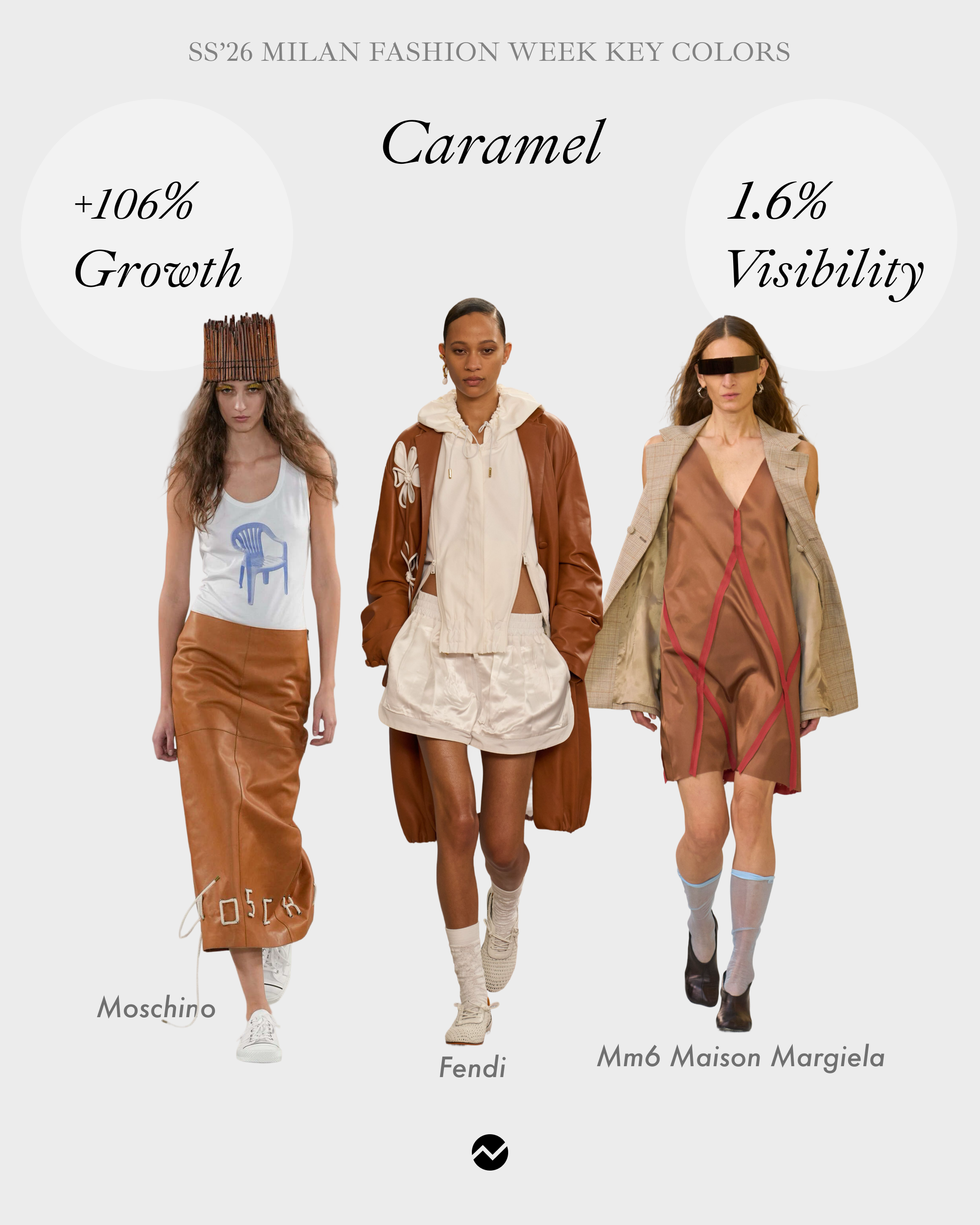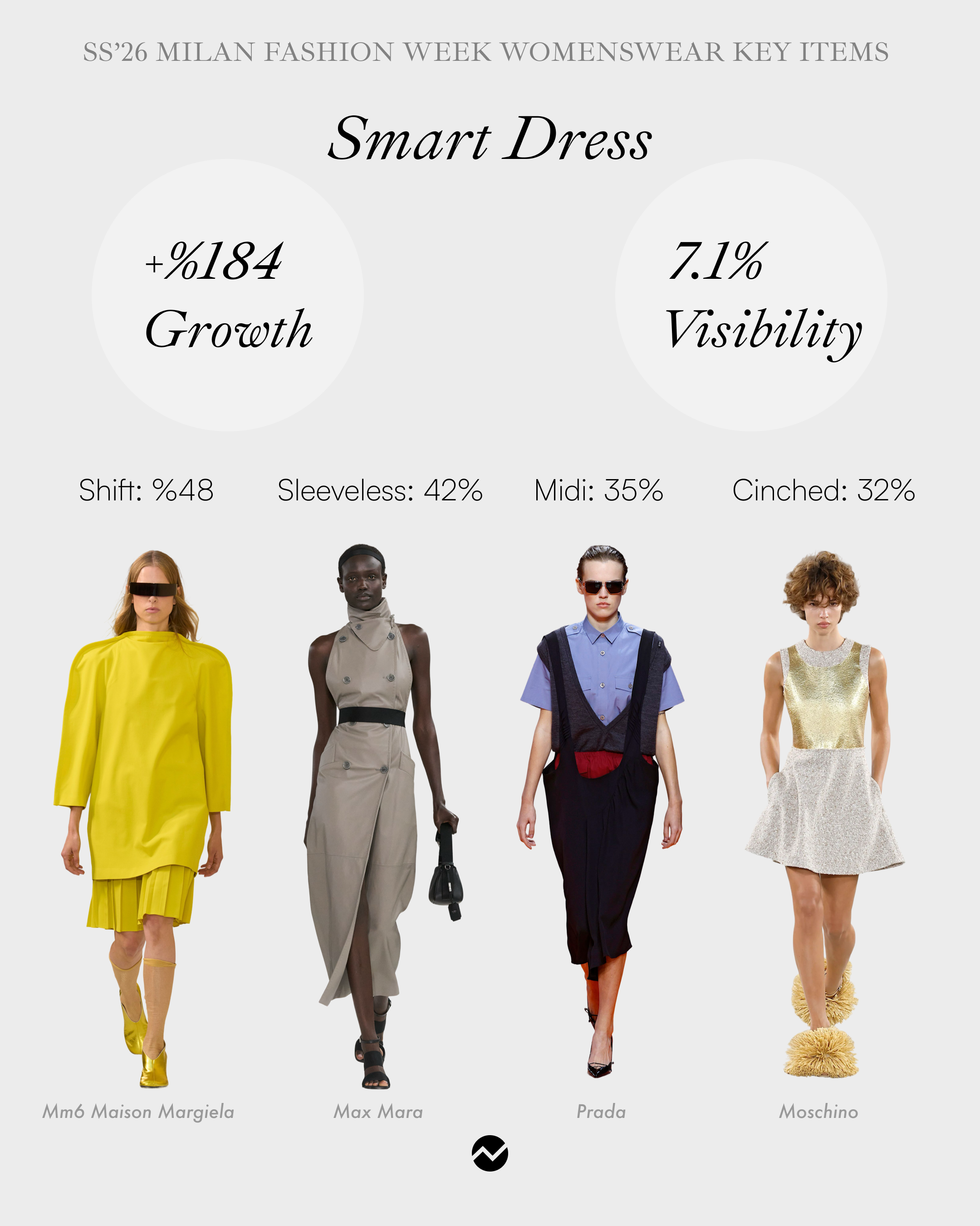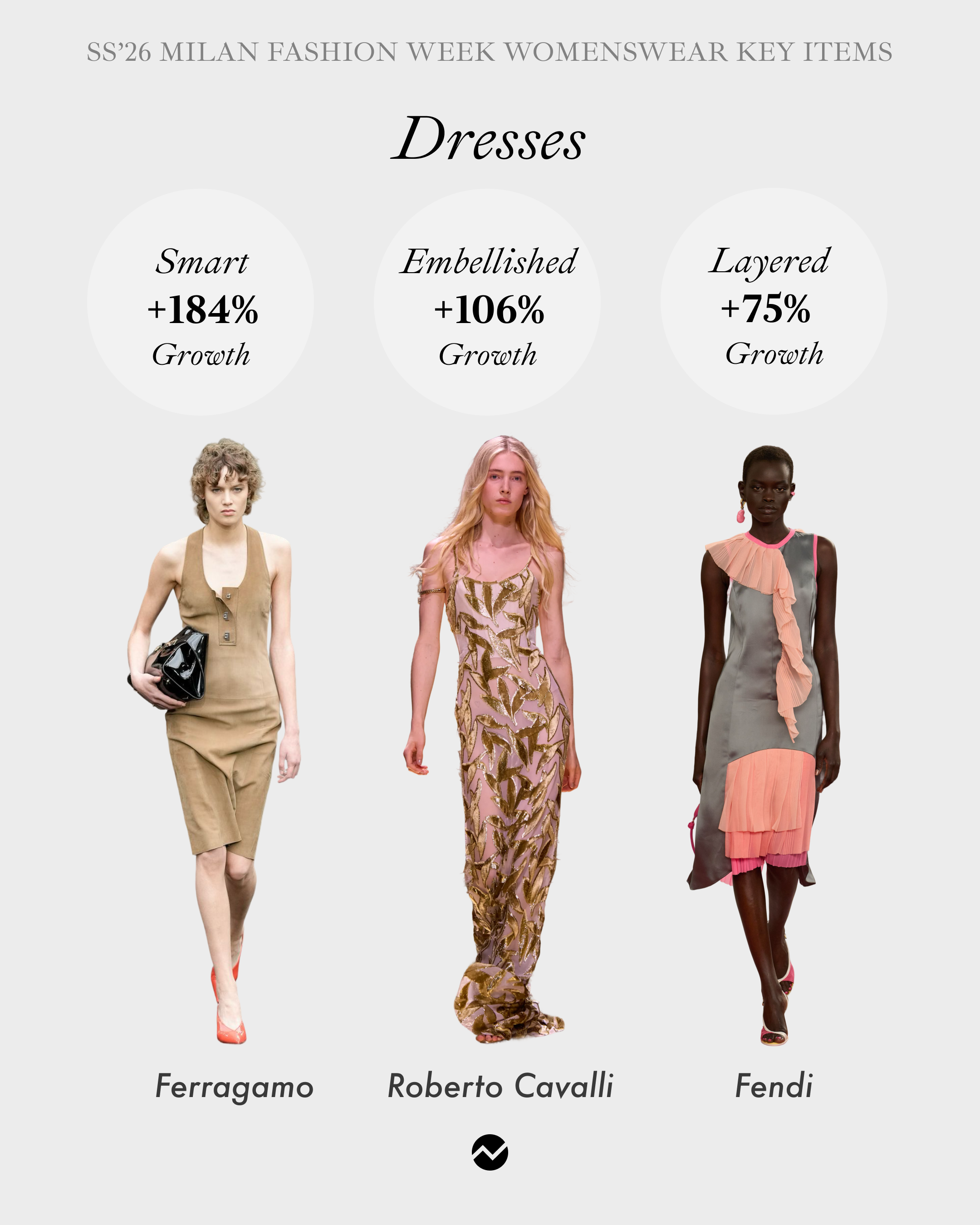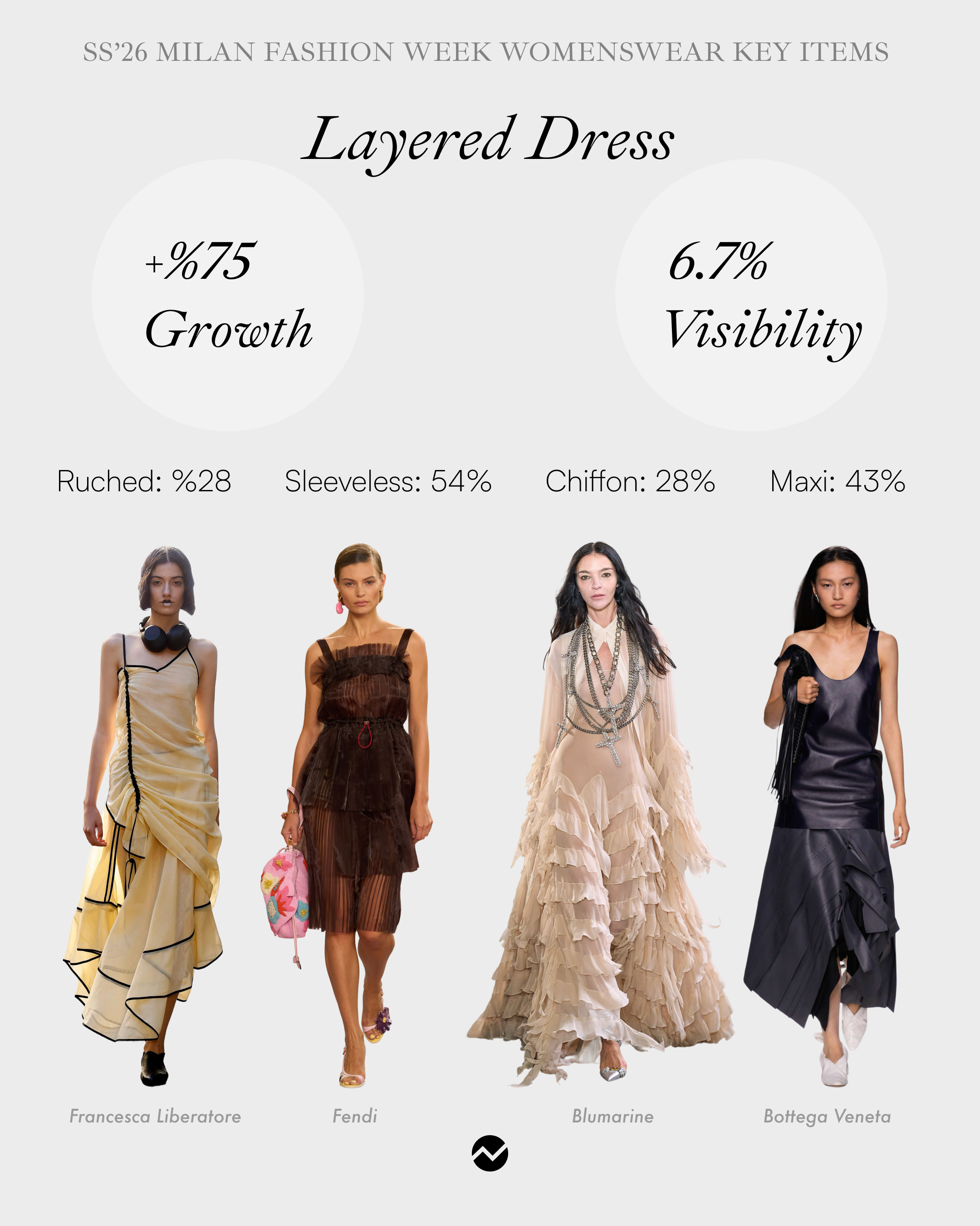 Dresses were the true highlight this season, with 800+ looks and a commanding 39% visibility (+3.2% growth) across collections. More than 50 designers featured dresses, confirming their central role in Milan’s S/S 26 runways.