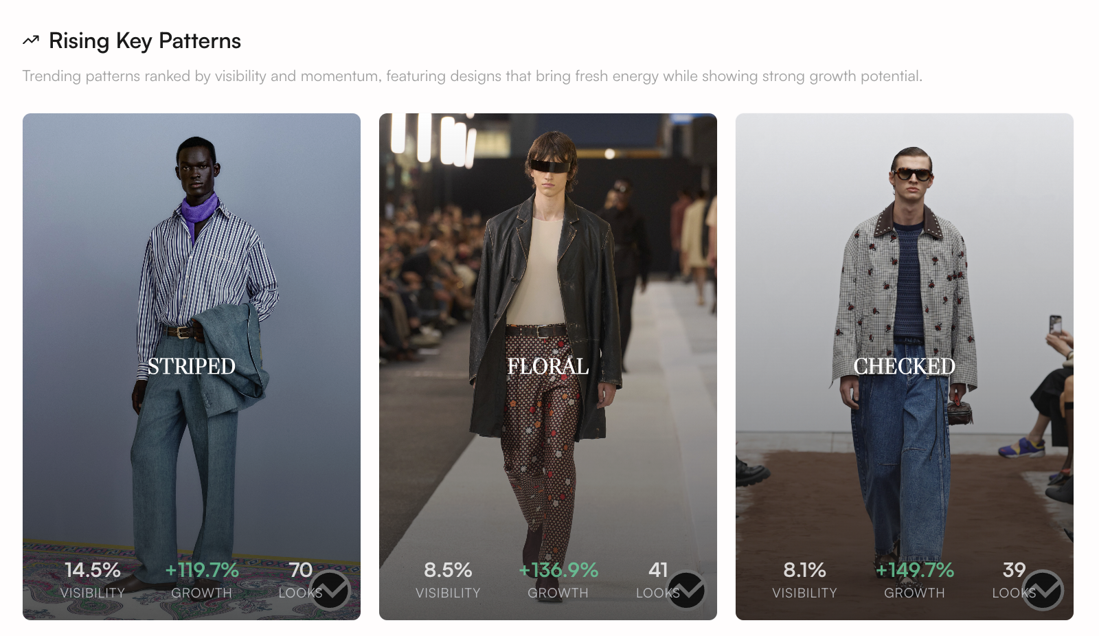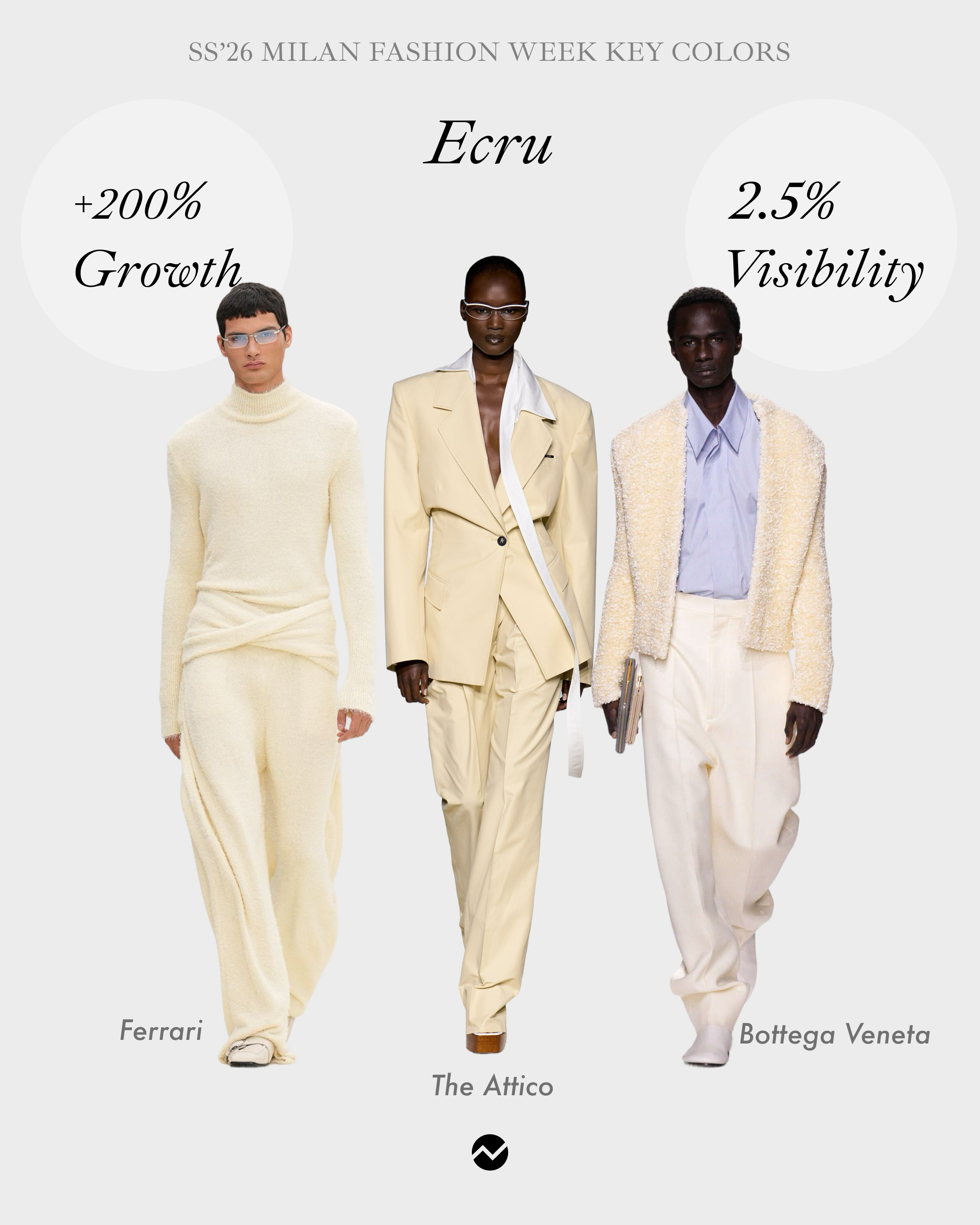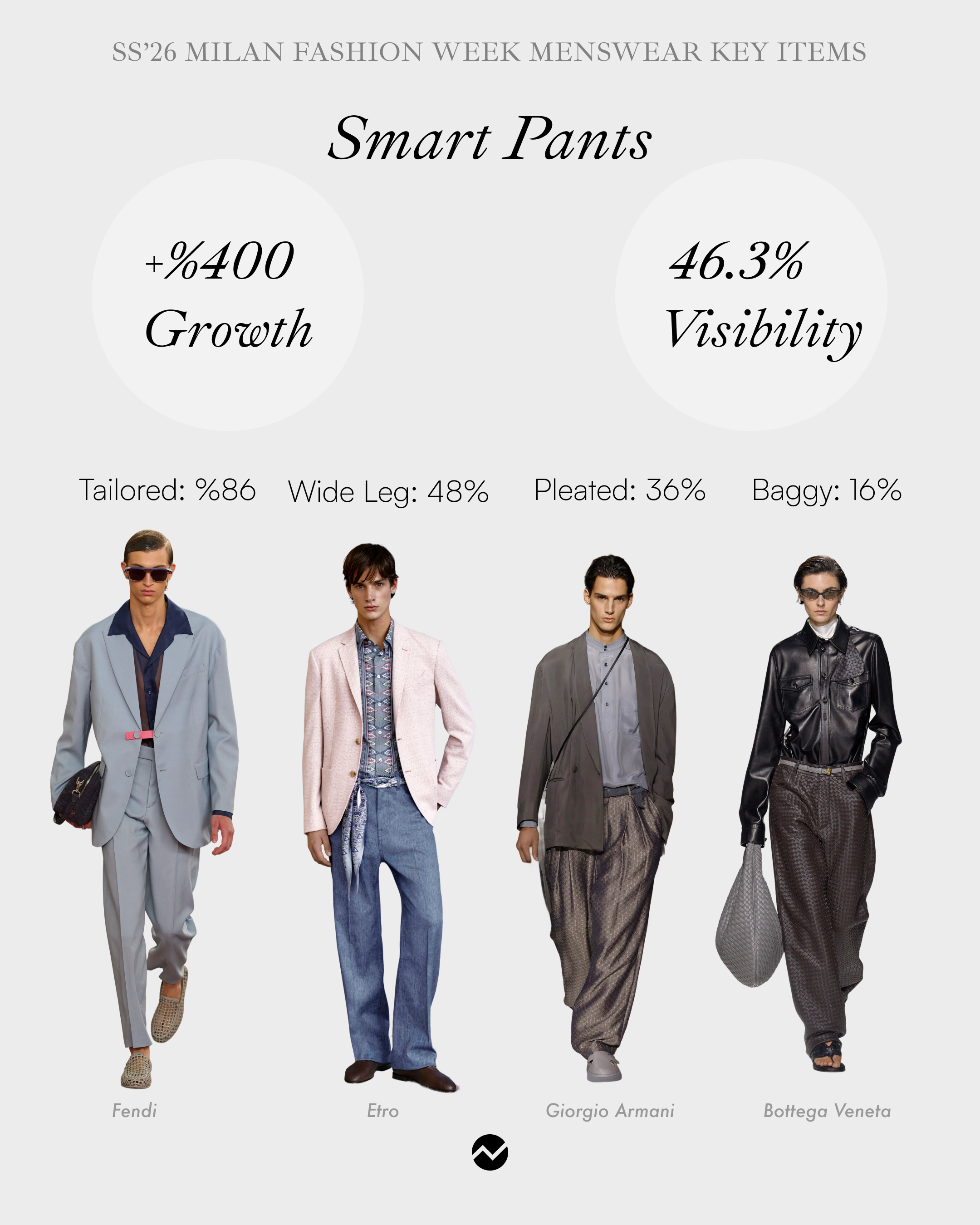 The strongest performer this season was undoubtedly the smart pant, with +400% growth and 46.3% visibility across collections. Designers reinterpreted pants with a modern edge, blending tailoring with relaxed fits.