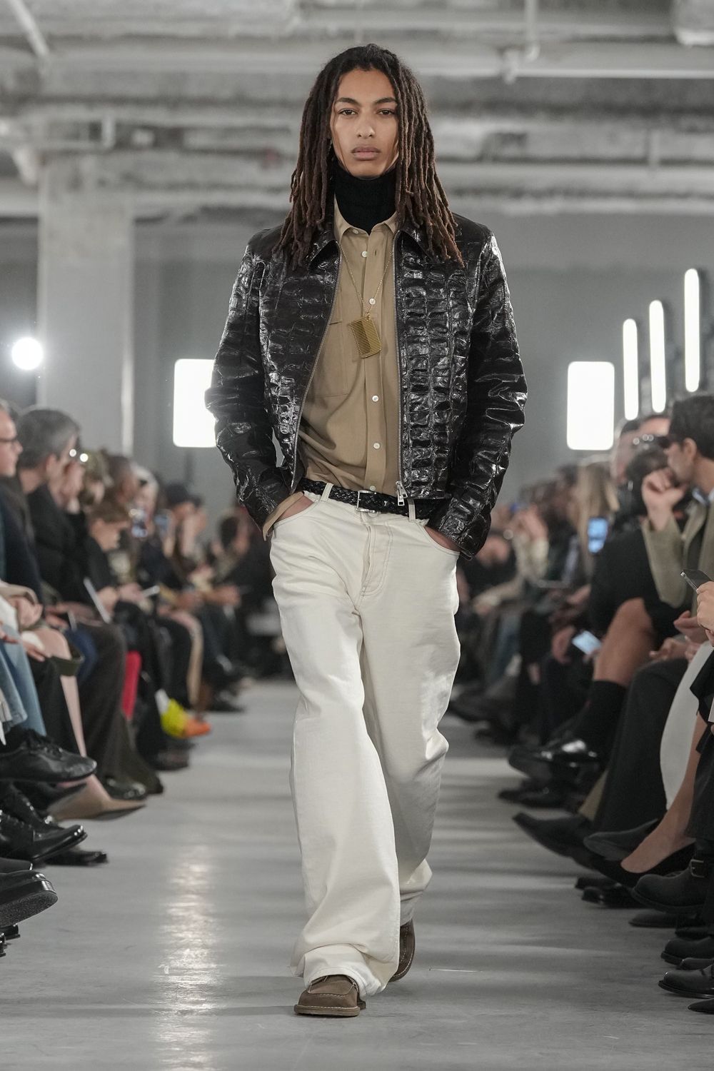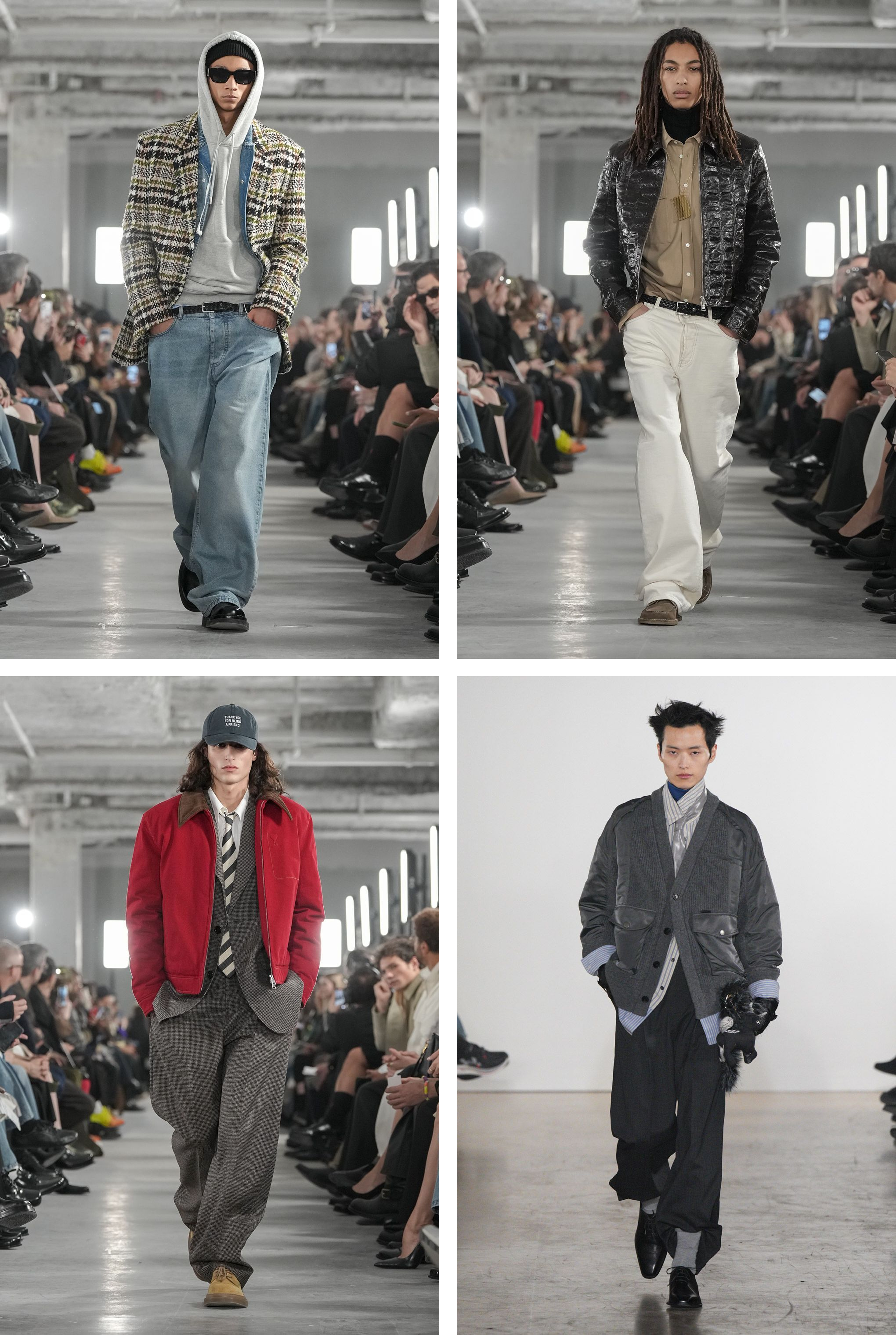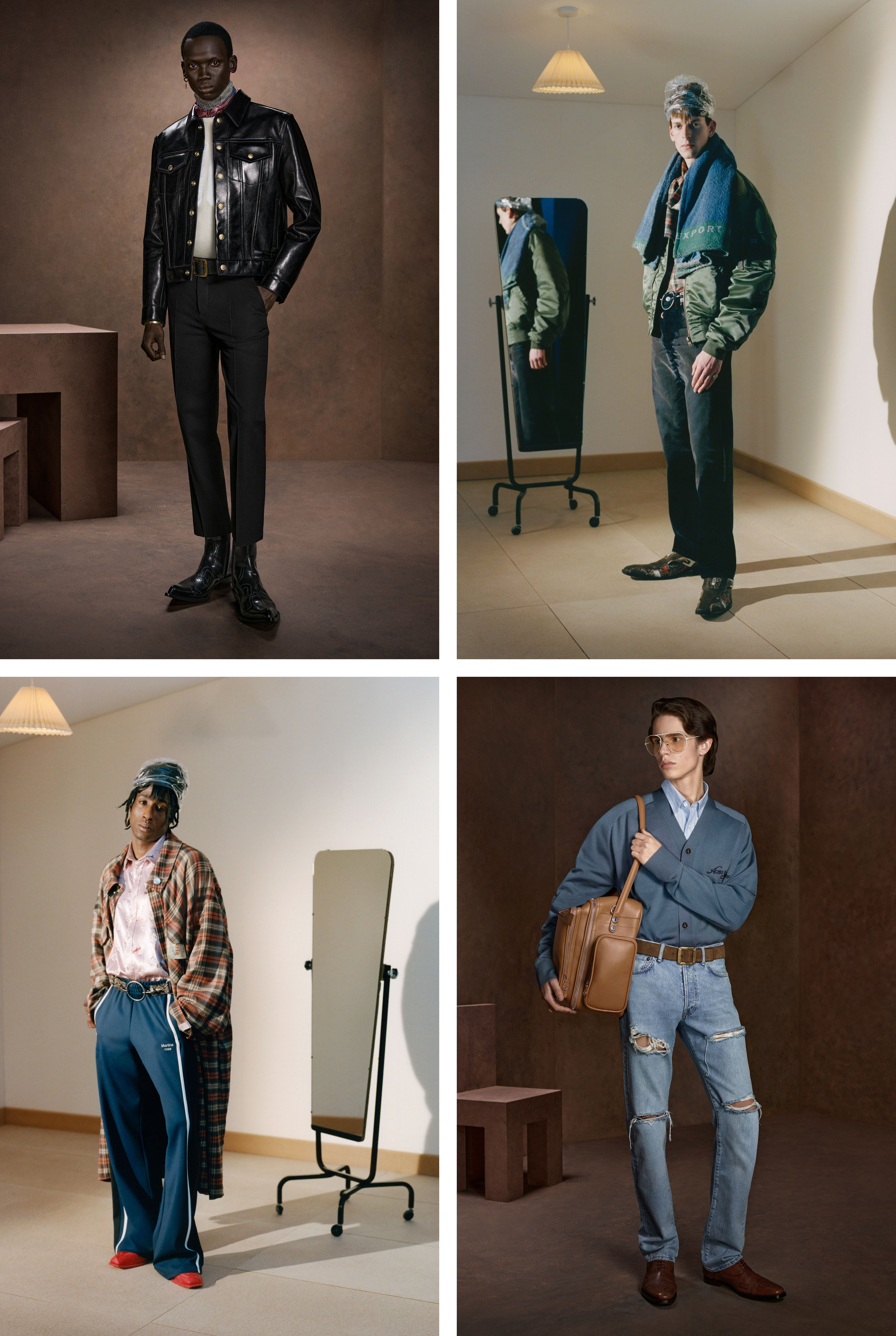 Leather runs head-to-toe. Jackets, trousers, over shirts. Jeans and Wools follow. Assertive but controlled. Plaids reappear to inject rhythm into otherwise restrained looks as on wools or peached cottons, breaking up surfaces. Texture is doing the work.